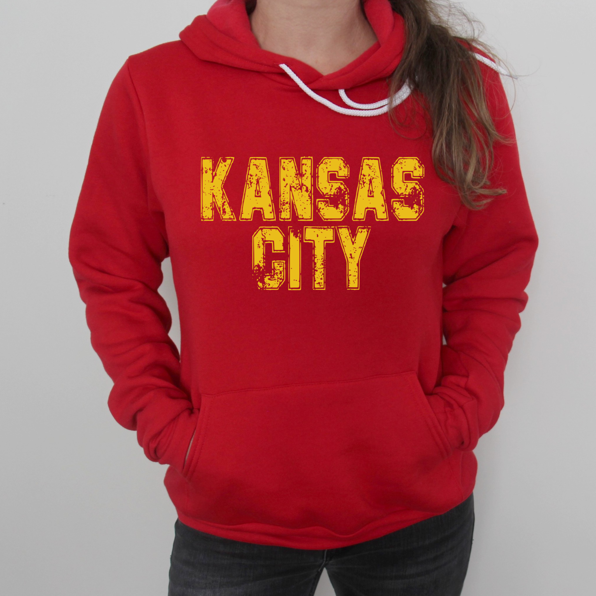 Stay comfy and cozy this football season! This red Bella Canvas sponge fleece sweatshirt features a distressed yellow Kansas City design.