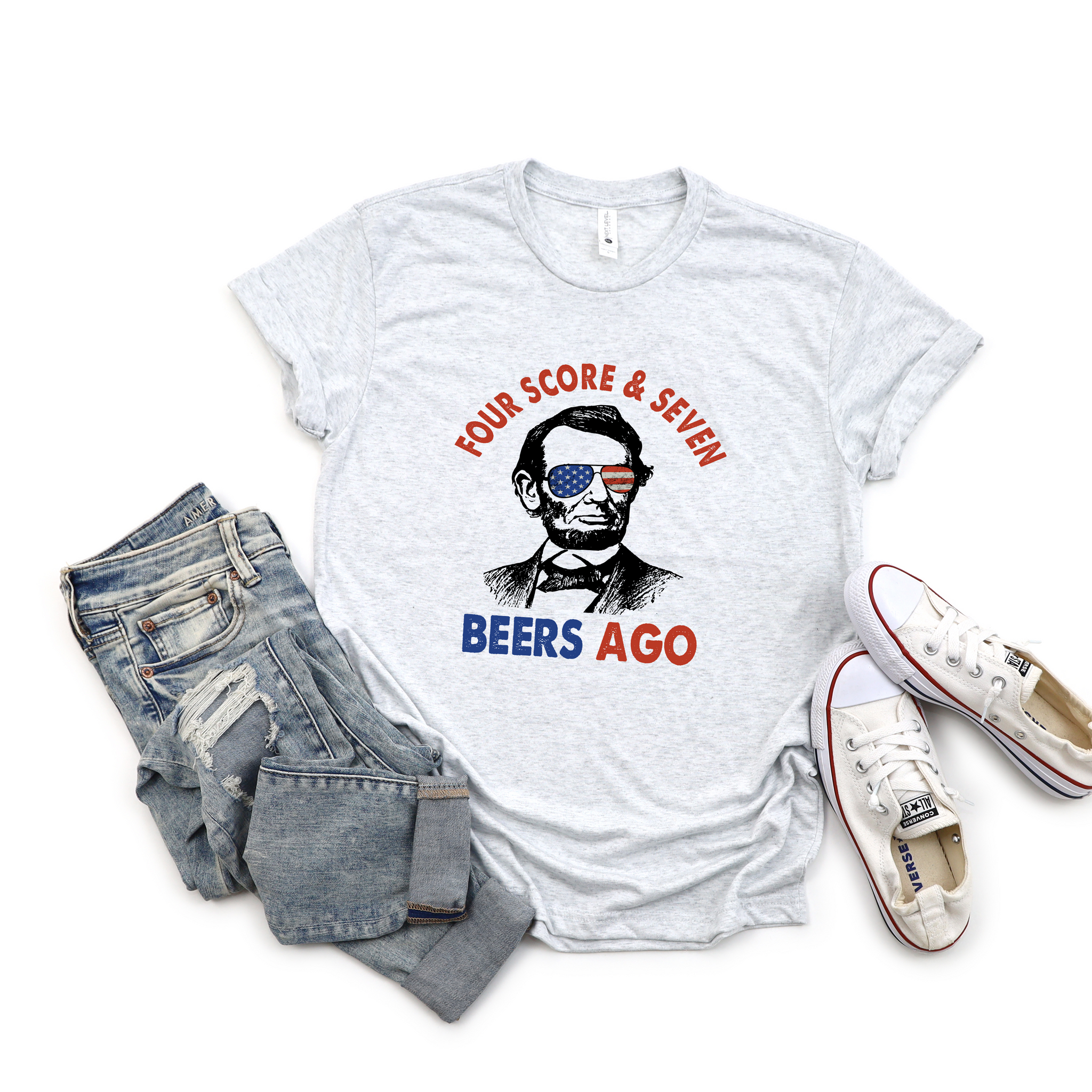 This soft Next Level heather white triblend tee features a sublimated "Four Score and Seven Beers Ago" Lincoln design.