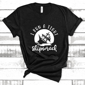 This soft and comfy Bella Canvas brand tee features the phrase "I Run A Tight Shipwreck" in white text.
