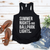 This soft and comfy Bella Canvas black flowy racerback tank features the phrase "Summer Nights and Ballpark Lights" in white.