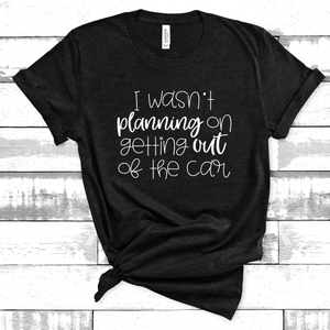 This soft and comfy black heather Bella Canvas brand tee features the phrase "I Wasn't Planning on Getting Out of the Car" in white text.