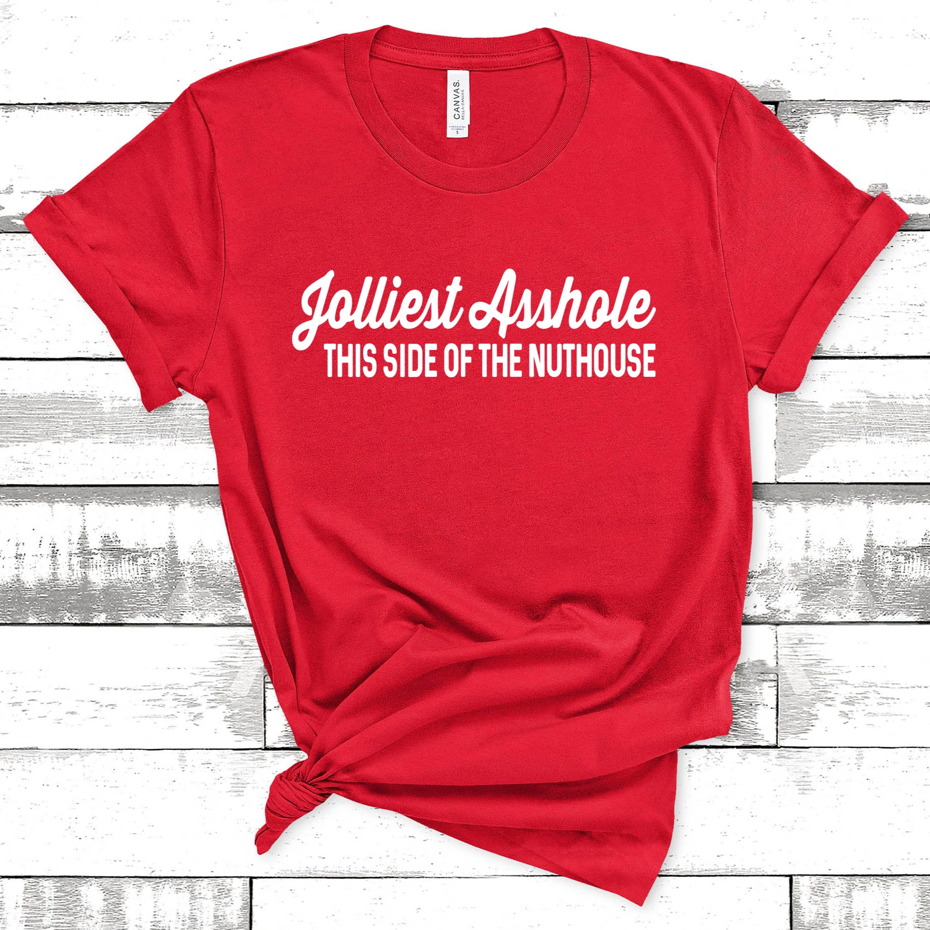 This soft and comfy Bella Canvas brand tee features the phrase "Jolliest Asshole This Side of the Nuthouse" from Christmas Vacation.
