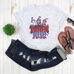 This soft and comfy Bella Canvas brand v-neck marble tee features a sublimated "Boom Bitch" firework graphic.