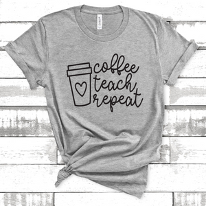 Bring on the coffee!  This soft and comfy athletic gray Bella Canvas brand tee features the phrase "coffee teach repeat" in black text.