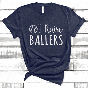 This soft and comfy Bella Canvas brand tee features the phrase "I Raise Ballers" in white text.