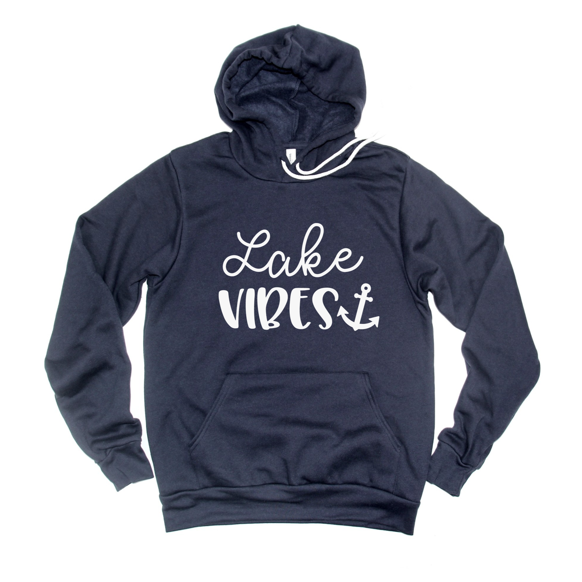 Stay warm during those cool nights at the lake with this navy "Lake Vibes" Bella Canvas sponge fleece sweatshirt.