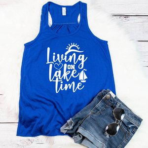 This soft and comfy Bella Canvas blue flowy racerback tank features the phrase "Living On Lake Time" in white.