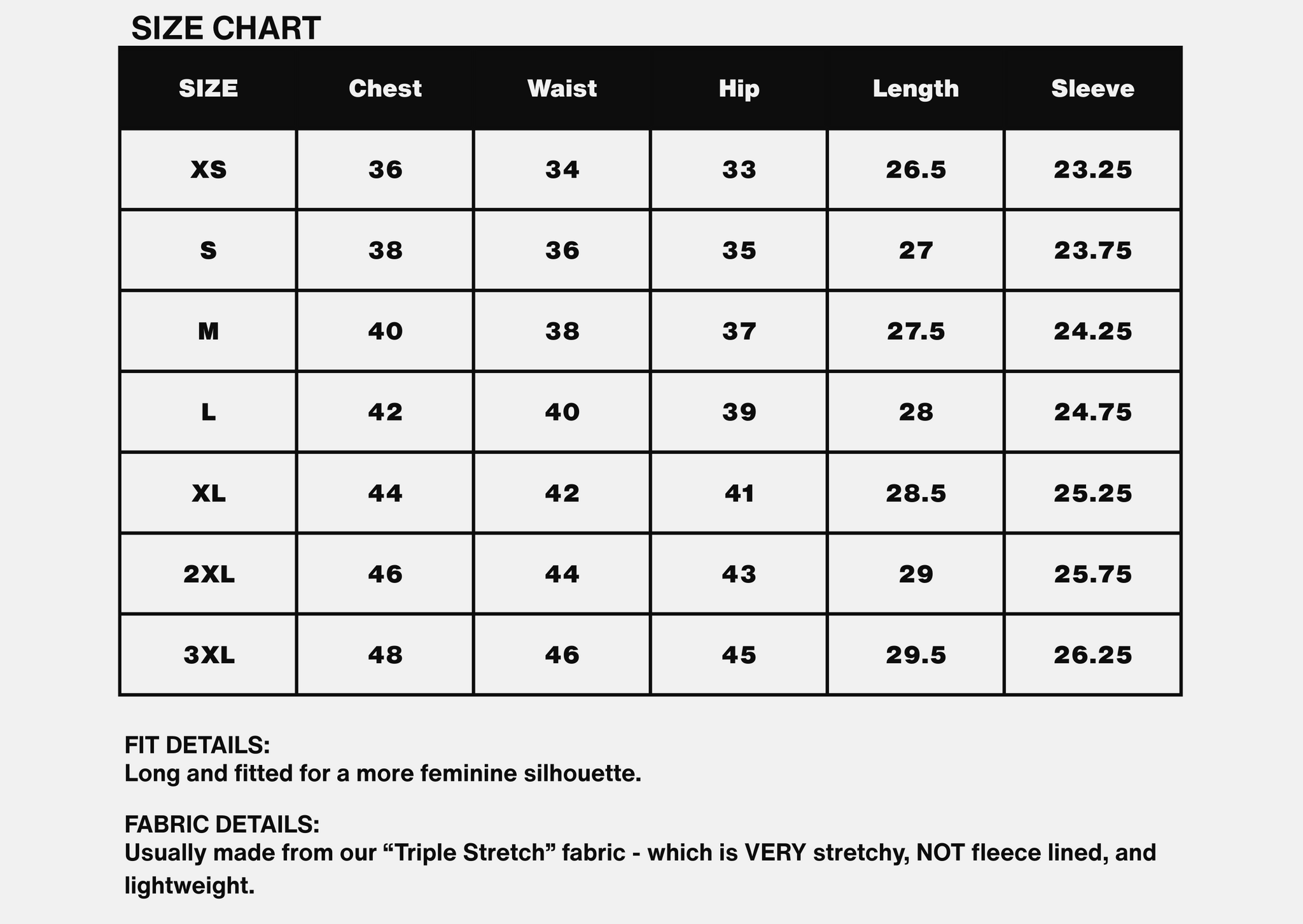 Jackets are triple stretch material with a longer torso and moderately true-to-size. For a larger fit, size up one. Please see size chart prior to ordering!
