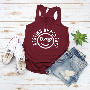 This soft and comfy Bella Canvas maroon flowy racerback tank features the phrase Resting Beach Face in white.