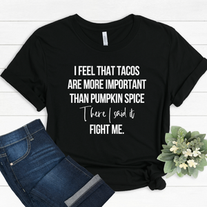 This soft and comfy Bella Canvas brand tee features the phrase "I Feel That Tacos are More Important Than Pumpkin Spice. There I Said It. Fight Me" in white.